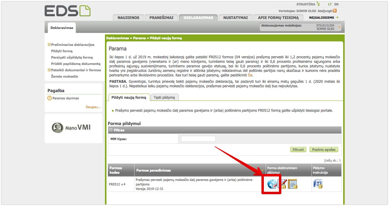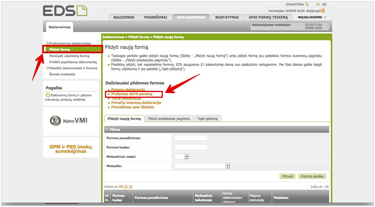 - В верхнем меню выберите «Deklaravimas» (Декларирование), затем слева — «Pildyti formą» (Заполнить форму).